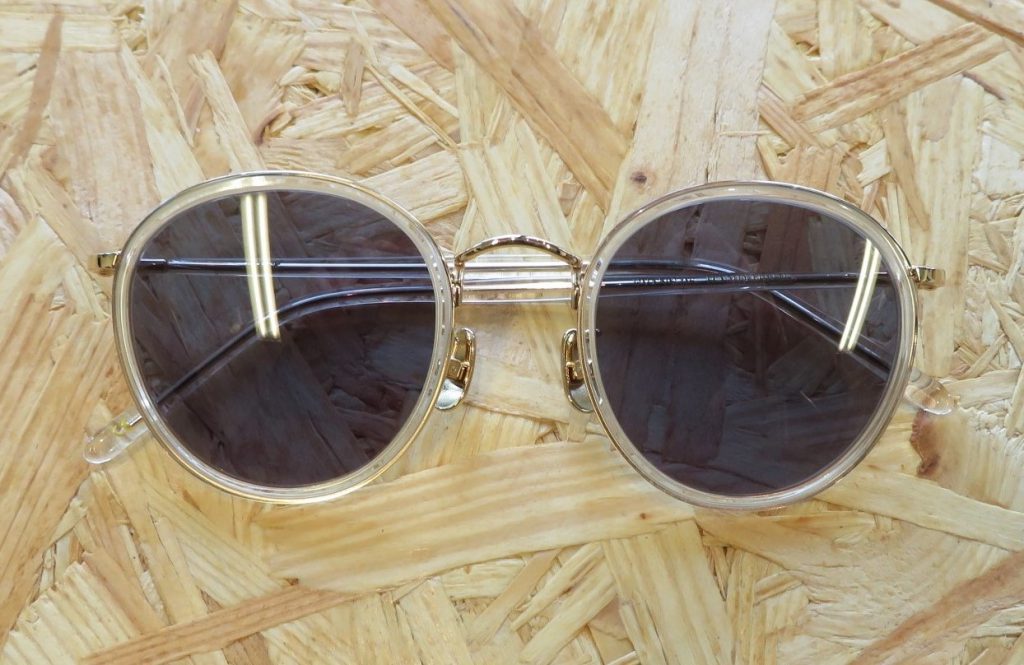 玉型をアセテート素材とメタルで挟み込んだラウンドモデル。