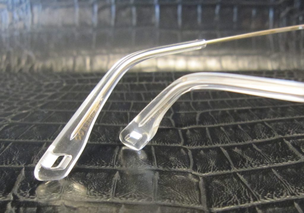 テンプルエンドには新デザインを採用。くり抜いた形はブランドロゴを象った意匠となっています。